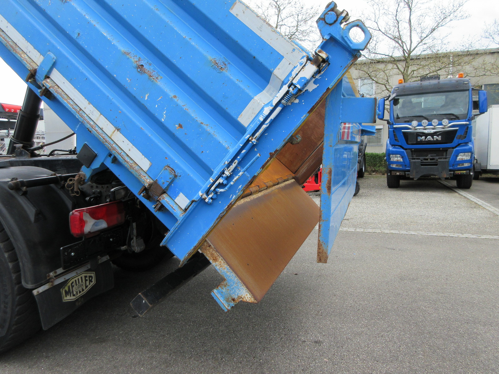 MKG-Kran HLK 231 HP a5, 5 hydraulische Ausschübe + 2 mechanische Ausschübe , Ausladung 18,71 m / 790 kg, Funk-Fernbedienung, Greifersteuerung, Meiller Gesteinskipper, hydraulische Klappe, Hydraulikanschlüsse für Kippanhänger, AP-Achsen, Rockinger Kupplungsmaul, Blattfederung, Abbiegeassistent, Rückfahrkamera, |