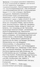| антенна на крыше, дополнительный соединительный элемент 12 в, механ./электр. настраиваемый поворотный рычаг, Fußraumbeleuchtung, Leseleuchten vorne, SCR-Technologie, Scheibenwaschdüsen beheizbar |