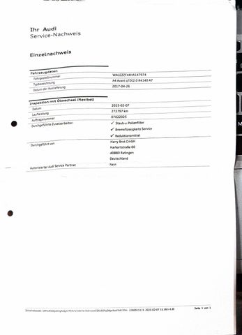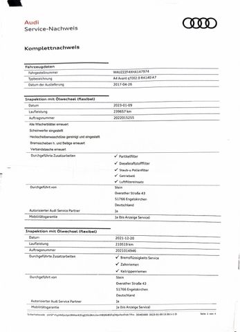 WILHELM LENHARDT AUTOMOBILE-SIEGEN.. seit über 27 Jahren für Sie da - - Kontakt zwischen 8- 17 Uhr per Telefon/& Whatsapp unter 0170-2042669 möglich ! - Contact between 8 am -5 pm by Phone/ & WhatsApp on +49170-2042669 ! - - Wir bitten Sie von voreiligen Preisverhandlungen Abstand zu nehmen, unsere Preise verstehen sich als Endpreise welche wir mit dem gelieferten Service anbieten. - - Bitte um beachtung das , bei Fahrzeugen mit einer Laufleistung über 150.000 Km, ist der verkauf - nur an Fachmann /Exporteur/Händler //Selbständigen //Werkstätten möglich ! ! - - PREISANFRAGEN WERDEN NICHT BEANTWORTET ! Dies ist keine AUKTION ! - Fahrzeug ist Unfallfrei, und aus 1 Hand. - - Video zum Fahrzeug/-Video of the vehicle : https://youtu.be/JREGS2F9djc - - Fahrgestellnummer WAUZZZF4XHA147974 - - Alle Fahrzeuge sind optimal gewartet und weisen eine lückenlose Fahrzeughistorie auf. - - grosse Inspektion am 07.02.2025 bei KM 272.797 durchgeführt ! - - Inspektion am 09.01.2023 inkl. neue Bremsen/-Beläge, Partikelfiter + Getriebeölwechsel u.v.m - - sonstiger Inspektionen siehe bitte das Bildmaterial - - - Sonderausstattung: - Assistenz-Paket Tour, Audi connect (Internetbasierende Dienste), Audi Smartphone Interface, Bluetooth-Freisprecheinrichtung mit Spracherkennung (Audi Phone Box), Dachhimmel Stoff, schwarz, Einparkhilfe vorn und hinten, akustisch und optisch mit selektiver Anzeige (APS Plus), Fahrassistenz-System: Anfahr-Assistent (hold assist), Fahrassistenz-System: Spurwechselassistent (Side Assist) inkl. Audi pre sense rear, Fahrer-Informations-System (FIS) mit Farbdisplay, Harnstofftank (SCR): 24 Ltr., Innenspiegel mit Abblendautomatik, Lenkrad (Leder - 3-Speichen) mit Multifunktion plus, Licht-Paket, LM-Felgen 7,5x17 (10-Speichen), LM-Felgen 7x17, Goodyear 225/50R17 98Y 6 mm (5-Parallelspeichen, für Winterbereifung), Metallic-Lackierung, Multi-Media-Interface MMI Navigation, Reserverad als Notrad, Seitenairbag hinten, Sitzheizung vorn, Sound-System DSP / Audi Sound-System, Verglasung hinten abgedunkelt (Privacyverglasung) und Türscheiben vorn Akustikglas, - - Weitere Ausstattung: - Airbag Fahrer-/Beifahrerseite, Antriebs-Schlupfregelung (ASR) mit EDS, Audi Drive Select, Außenspiegel asphärisch, links, Außenspiegel asphärisch, rechts, Außenspiegel elektr. verstell- und heizbar, Außenspiegel Wagenfarbe, Blinkleuchten LED in Außenspiegel integriert, Bremsassistent, Dachkantenspoiler, Dachreling eloxiert, Einstiegsleisten mit Aluminiumeinlage, Elektron. Differentialsperre (EDS), Fahrassistenz-System: City-Notbremsfunktion (Audi pre sense City), Fahrassistenz-System: Müdigkeitserkennung (Pausenempfehlung), Gepäck-/Laderaumabdeckung elektrisch, Gepäckraum-Abtrennung (Netz), Gepäckraumklappe elektr. betätigt (öffnen + schliessen), Geschwindigkeits-Begrenzeranlage, Glanz-Paket, Innenausstattung: Dekoreinlagen Aluminium, Isofix-Aufnahmen für Kindersitz, Karosserie: 4-türig, Klimaautomatik, Kopf-Airbag-System (Sideguard), Ladekantenschutz (Edelstahl), Lendenwirbelstützen vorn, elektr. verstellbar, Motor 2,0 Ltr. - 140 kW 16V TDI, Multi-Media-Interface MMI Basic Plus / MMI Radio Plus, Raucher-Paket, Reifenkontroll-Anzeige, Rücksitzlehne geteilt/klappbar, Schadstoffarm nach Abgasnorm Euro 6, Scheibenwaschdüsen heizbar, SCR-System (AdBlue-Technologie), Seitenairbag vorn, Sitzbezug / Polsterung: Stoff System, Sitze vorn manuell einstellbar, Sportsitze vorn, Start/Stop-Anlage, Stoßfänger Sport-Design (S-line), Wendeladeboden (Ladeboden), Wärmeschutzverglasung grün getönt - - UNSERE SERVICEANGEBOTE: - Deutschlandweite Lieferung, Ankauf / Inzahlungnahme, Abholservice vom Bahnhof, Professionelle Autoaufbereitung & Detailing, Ummeldung / Anmeldung / Kurzkennzeichen / Zollkennzeichen auf Wunsch möglich !, Öffnungszeiten: Nur nach Terminvereinbarung ,bezüglich der Besichtigung und einer eventuellen Probefahrt - - Alle unseren Fahrzeuge sind aus Inzahlungsnahmen/-Leasingrücklauf, mit Wartungsunterlagen, Rechnungen und Serviceheft. Die Laufleistungen sind original, nachweisbar und der KM-Stand wird schriftlich bestätigt . - - Die Fahrzeugbeschreibung dient lediglich der allgemeinen Identifizierung des Fahrzeugs und stellt keine Zusicherung im kaufrechtlichen Sinn dar. Die Angaben erheben keinen Anspruch auf Vollständigkeit. Die gemachten Angaben/Beschreibungen sind unverbindlich und dienen nicht als zugesicherte Eigenschaften. Der Verkäufer übernimmt keine Haftung für Tipp- und Datenübermittlungsfehler. Ausstattungen sind gegebenenfalls gesondert zu prüfen - |