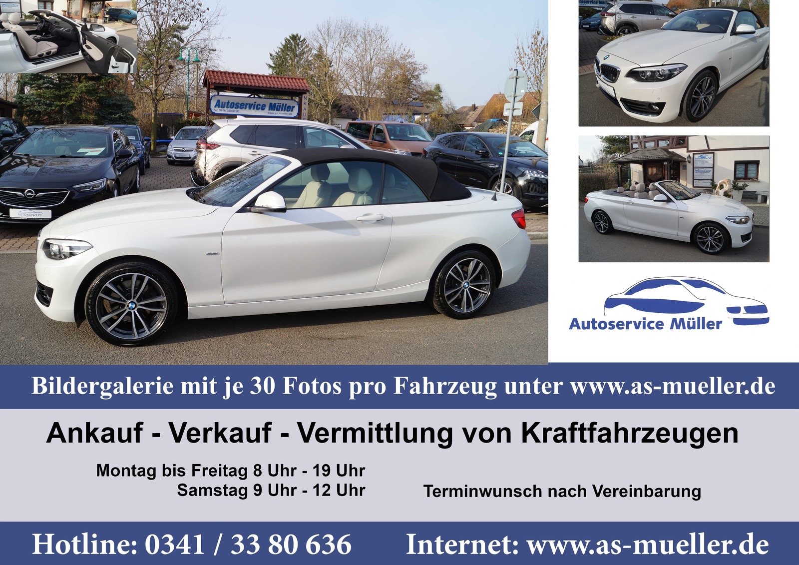 Fahrzeug bei BMW Scheckheft gepflegt - Rechnungen dazu. Sommerbereifung neu Bei Fragen zum Fahrzeug usw. telefonische Kontaktaufnahme bevorzugt. Bei Interesse am Fahrzeug vereinbaren Sie bitte einen Termin zu einer Besichtigung. Terminvereinbarung für Beratung und Probefahrt = kürzere Wartezeiten:, Zeit ist kostbar und diese sollten Sie nicht mit Warten verbringen. Deshalb bitten wir Sie um eine telefonische Terminvereinbarung für eine Beratung oder zur Probefahrt., --- Super Fotogalerie und Informationen zur Firma finden Sie direkt unter --- =========================================================== www.as-mueller.de Kurzzeitkennzeichen Nummer zur Überführung ihres neuen Fahrzeuges können gern nach Absprache von uns bereit gestellt werden. Es können auch individuelle Termine außerhalb der Öffnungszeiten bei „ernsthaftem Kaufinteresse“ vereinbart werden. Außerhalb der Öffnungszeiten unter Mobil 0172/5102340 gern auch per whatsapp - Kfz Meisterbetrieb seit 1990/ 36 Jahre - Garantie bis 24 Monate als Anschlussgarantie möglich- Garantie Bedingungen laut Garantie Gesellschaft und Garantiepass – bitte Fragen Sie nach, wir informieren Sie gern. - Finanzierung des Fahrzeuges auch ohne Anzahlung/ Inzahlungnahme Fahrzeug - Gebrauchtwagen Gütesiegel auf Anfrage ________________________________________________________________________________________ - Versehentliche Irrtümer / Eingabefehler / Änderungen und Zwischenverkauf vorbehalten. Trotz sorgfältiger Überprüfung all unserer Preisauszeichnung, kommt es immer wieder vor, dass sich Fehler einschleichen. Teilweise werden diese durch Übertragungsfehler in den Systemen der verschiedenen Plattformanbieter verursacht. Aber auch Irrtümer unsererseits sind nicht auszuschließen. Daher möchten wir Sie darauf hinweisen, dass sich alle Angaben ohne Gewähr verstehen und keinen Rechtsanspruch darstellen. Legen Sie besonderen Wert auf ein bestimmtes Ausstattungsmerkmal unseres Inserats, so teilen Sie es bei Vertragsabschluss gerne mit |