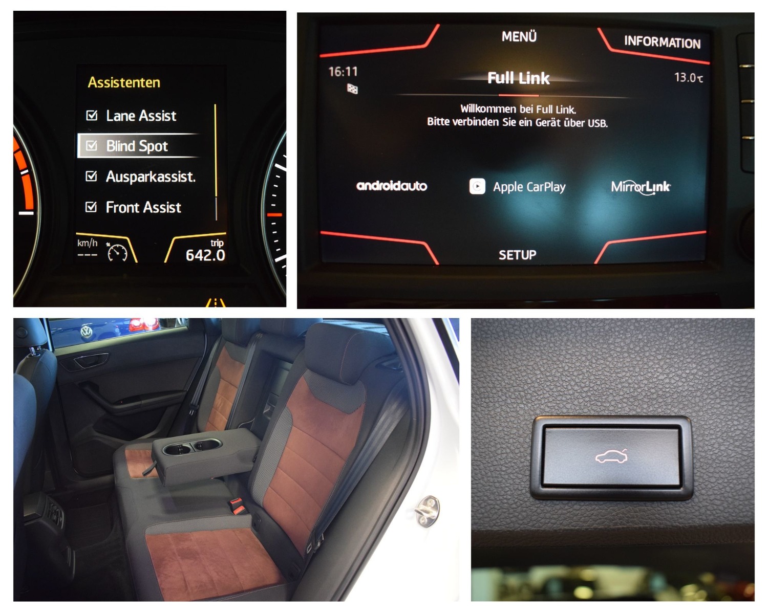 - Der einziger Halter war eine Privatperson - Durchgehende Servicehistorie bei Seat vorhanden - Die letzte Inspektion wurde bei 54.102 km durchgeführt, - Sonderausstattung: Anhängevorrichtung schwenkbar, Fahrassistenz-Paket V, Automatische Distanzregelung (ACC) bis 210 km/h, Fernlichtassistent, Toter-Winkel-Assistent, Spurhalteassistent, Stauassistent, Notfallassistent, Ausparkassistent, Verkehrszeichenerkennung, Sensorgesteuerte Heckklappe elektrisch zu betätigen, Navigationssystem "Plus", Digitaler Radioempfang DAB+, WLAN-Audio-Streaming, SEAT Sound-System, Connectivity Box inkl. Wireless Charger, Full Link - MirrorLink mit Apple Carplay und Android Auto, Panorama-Glas-Schiebedach, elektrisch mit Sonnenschutzjalousie, Voll-LED-Scheinwerfer, Dynamische Leuchtweitenregulierung, Paket: Winter, Scheibenwaschdüsen beheizbar, Vordersitze beheizbar, Parklenkassistent mit Ultraschall-Einparkhilfe, Standheizung inkl. Fernbedienung, Top-View-Kamera inkl. Rückfahrkamera, Allradantrieb 4Drive, ISOFIX-Kindersitz-Sicherungssystem, Climatronic mit elektronischer Temperaturregelung, Kühlergrill in Brillant schwarz, Paket: LED-Innenlicht, Ambientelicht, Schlüsselloses Schließ- und Startsystem "Kessy", SEAT Drive Profile mit "Driving Experience"-Knopf und Progressivlenkung, Komfortsitze vorne, Lendenwirbelstütze für Fahrer und Beifahrer, |
